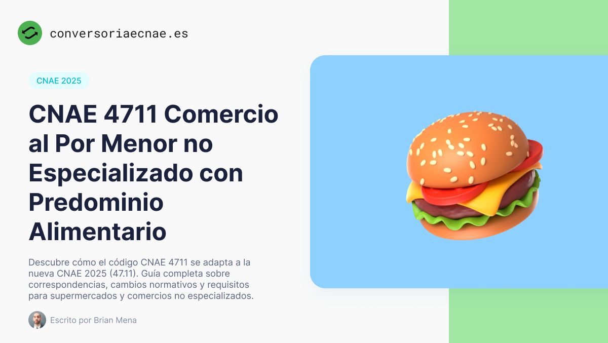 El código CNAE 4711 "Comercio al por menor en establecimientos no especializados, con predominio en productos alimenticios, bebidas y tabaco" se transforma en el código 47.11 en la nueva clasificación CNAE 2025, manteniendo prácticamente la misma definición pero con una denominación actualizada: "Comercio al por menor no especializado con predominio de productos alimenticios, bebidas y tabaco".